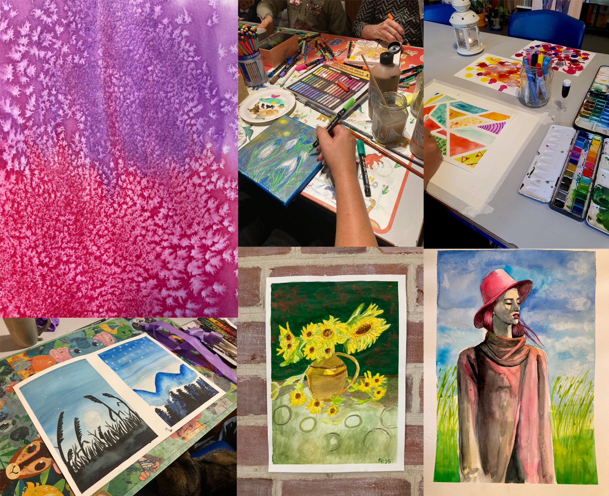 Wichtig ist immer eines: anfangen und sich trauen! Bei uns können verschiedene Maltechniken erlernt werden. Wir stellen alle Materialien (diese sind im Kursgeld enthalten), es muss also nichts mitgebracht werden, außer es wird explizit im Beschreibungstext erwähnt.