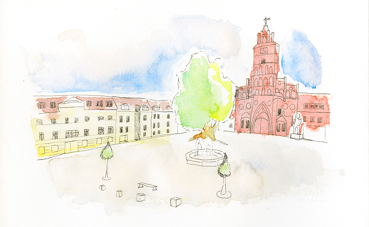 Zusammen mit der Künstlerin Elli Swonken können die Teilnehmer nicht nur die Stadt erkunden und Wissenswertes über Gebäude und Plätze erfahren, sondern diese Eindrücke auch künstlerisch auf Papier festhalten. Die Teilnehmer lernen dabei unterschiedliche Techniken kennen und können sich in verschiedenen Farben ausprobieren. Grundlegende Fragen zum Bildaufbau, zur Rolle von Licht und Schatten sowie zur richtigen Handhabung der Materialien werden geklärt.